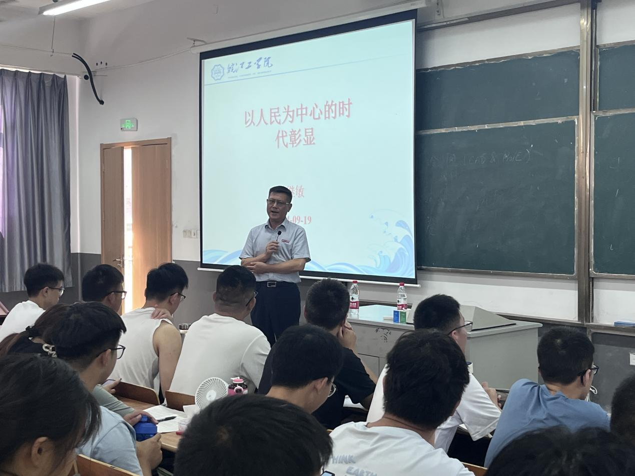 校长吴继敏以“以人民为中心的时代彰显”为主题,为21电气专业的同学们上一堂生动的思想政治理论课。他以人民为中心思想的发展脉络,系统讲授“以人民为中心、党的不同时代的领导人、毛泽东与为人民服务、习近平与为人民服务、以人民为中心在高校”等教学重点。他表示,要树立群众路线、贯彻群众路线,将学生回归教育主体,教职工回归管理主体,一切以学生为本,关爱学生。