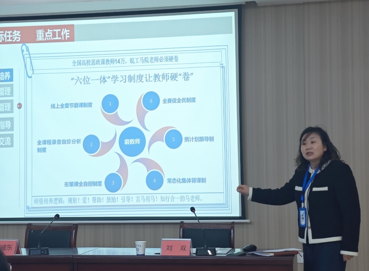 刘双非常感谢银龄专家对学院的大力支持并介绍开会初衷。她提到,25年学校要迎接本科合格评估,不仅与学校、学院后续发展息息相关,与每一位老师也紧密相连,并对2024年度学院各项工作进行总结,部署寒假磨课备课相关工作,传达了教育部会议精神。同时,公布成立马克思主义学院第一届学术委员会的通知文件。