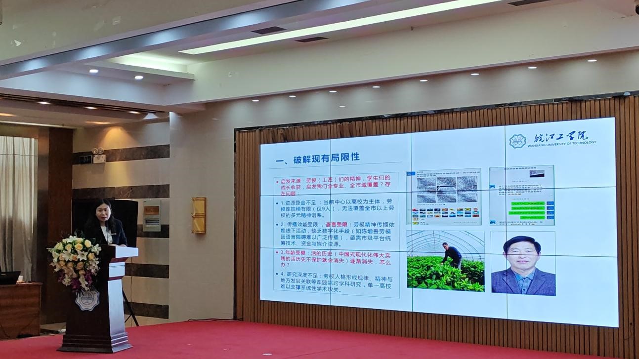 刘双介绍马鞍山市劳模(工匠)精神研究传播中心设立初衷、建设情况、发展规划等内容。她提到,通过我校“劳模(工匠)讲思政课”为切入点,将劳模(工匠)故事转化为具象化、场景化的教育资源,挖掘马鞍山市劳模(工匠)群体的历史价值和时代精神,创新劳模精神传播途径,提炼“马鞍山经验”,为地方高质量发展提供精神动力和人才支撑。