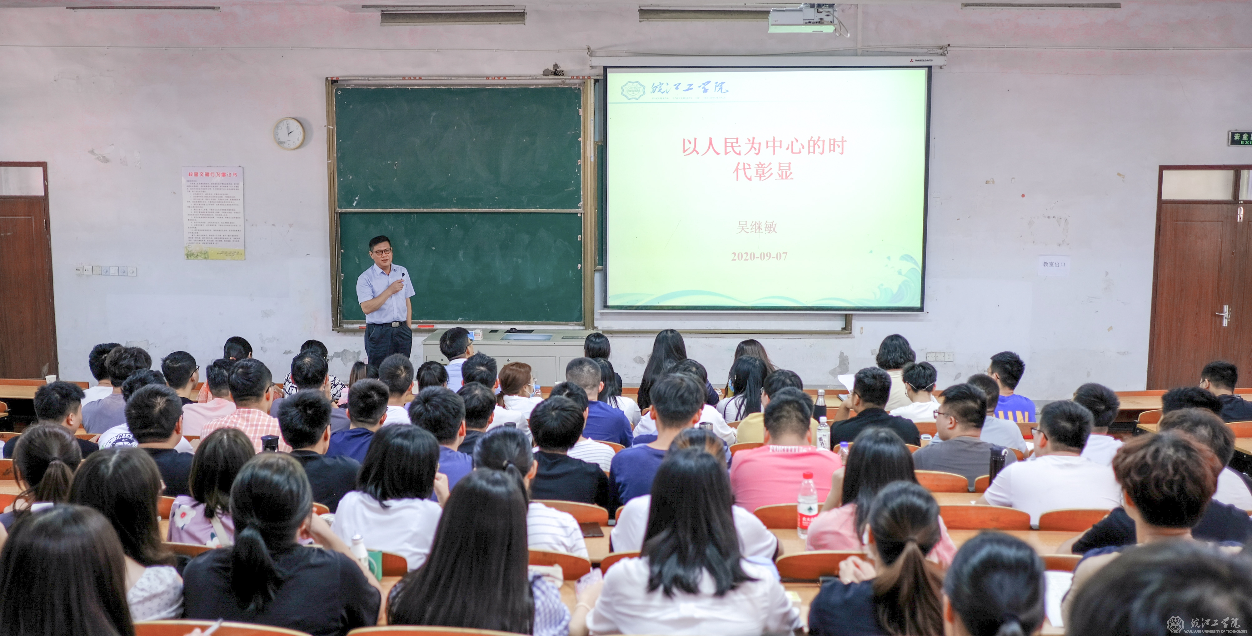 吴校长开学第一课以“以人民为中心的时代彰显”为主题,整场报告由“以人民为中心、党在不同时代领导人(时代彰显)、毛泽东与为人民服务、习近平与以人民为中心、以人民为中心在高校”五个部分构成,ppt课件31页,备课讲义内容更新到9月7日当天。报告从中国革命史的延安精神讲到中国特色社会主义的精神实质及丰富内涵,进而讲到在高校以“尊重老师和关爱学生”的以人民为中心的理念践行。在报告的第五部分,他还介绍了我校以人民为中心理念的践行的具体措施——学生教育制度体系构建和教育平台设计及建设,引起同学们的极大兴趣。