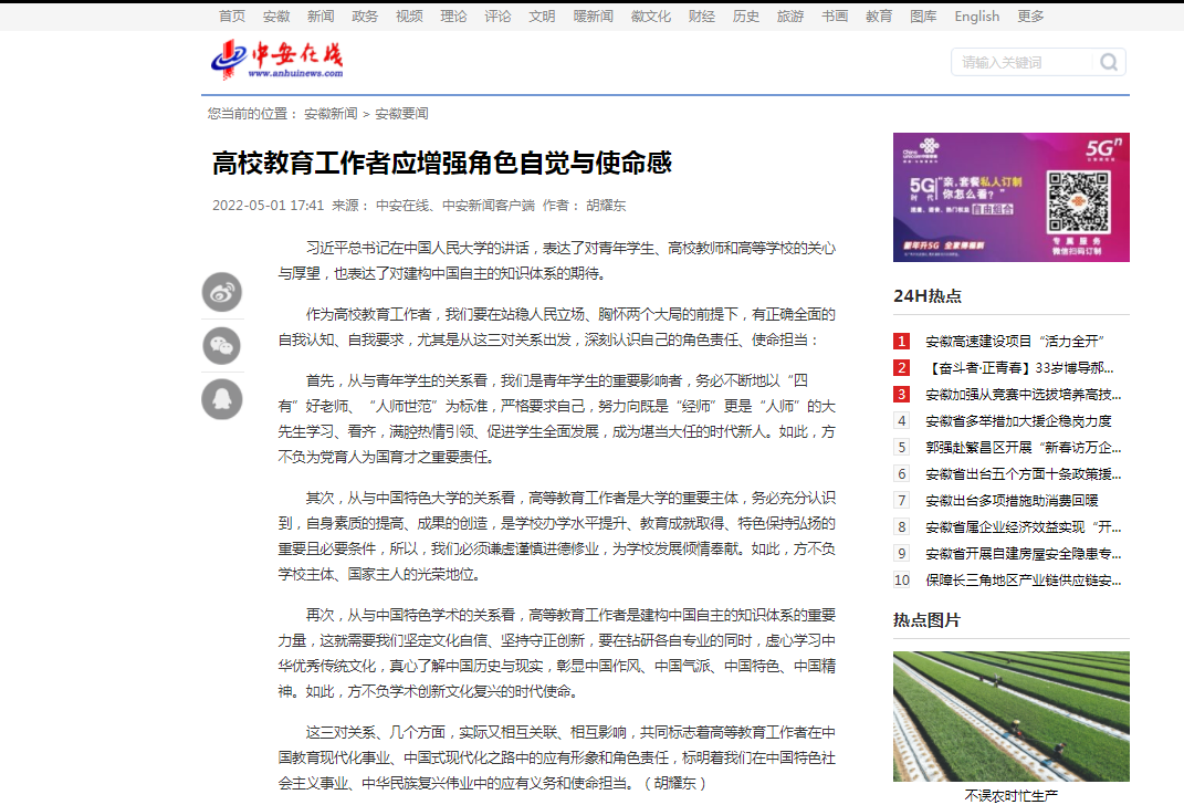 为深入学习贯彻习近平总书记在中国人民大学考察时重要讲话精神,近日,我校副教授胡耀东代表马克思主义学院在学校学习会上发表言论,并以第一作者身份在《中安在线》媒体发表题为《高校教育工作者应增强角色自觉与使命感》的评论员文章,指引我们作为高校教育工作者,要在站稳人民立场、胸怀两个大局的前提下,有正确全面的自我认知、自我要求,应增强角色自觉与使命感。全文如下: