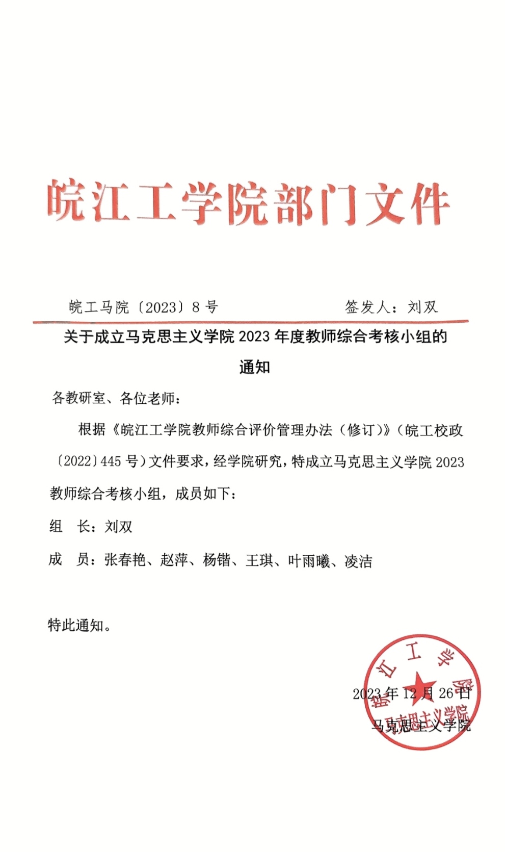 关于成立马克思主义学院2023年度教师综合考核小组的通知