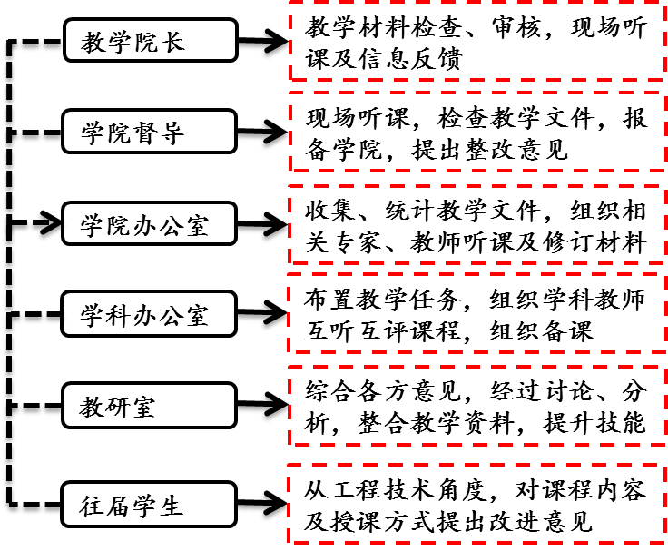 教学院长、教学委员会、督导、主讲教师 | (1)课程内容与课程目标不匹配;(2)教学资料、试卷分析等不全;(3)教学过程、考核方式不足;(4)课程目标对毕业要求的支撑不合理。 | (1)课程内容与课程目标匹配合理; (2)教学资料、试卷分析等齐全;(3)教学过程、考核方式合理;(4)课程目标能够对毕业要求进行合理支撑。 |