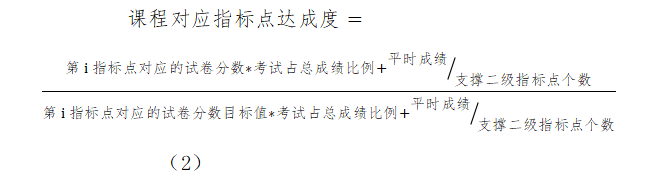 式中,最终成绩—取评价课程学生总成绩的平均值,如果课程对应多项毕业要求指标点,默认各指标点达成度相同;最终成绩目标值—100分;指标点对应的试卷分数—取评价课程各指标点对应试题的部分均值;指标点对应的试卷目标值—100分;比重—试卷成绩占总成绩的百分比;平时成绩目标值—总成绩中,平时成绩总分值;等级成绩—优、良、中、及格、不及格5个等级成绩,对应数字成绩分别为90分、80分、70分、60分、50分;等级成绩目标值—100分。