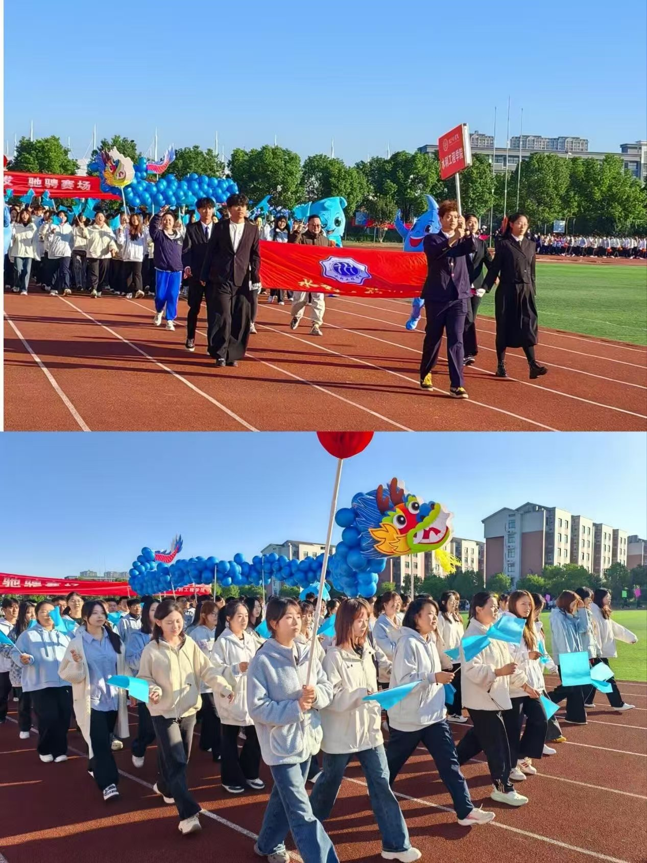 开幕式在激昂的《运动员进行曲》中启动。校旗护卫队步伐铿锵,率先入场;紧随其后的会徽方阵精神抖擞。水利工程学院方阵尤为引人注目,队员们身着统一服装,步伐坚定,阵中灵动的小水滴扮演者象征着水利人“上善若水、刚健不息”的品格,展现出“以水润心、以力筑梦”的青春信念。