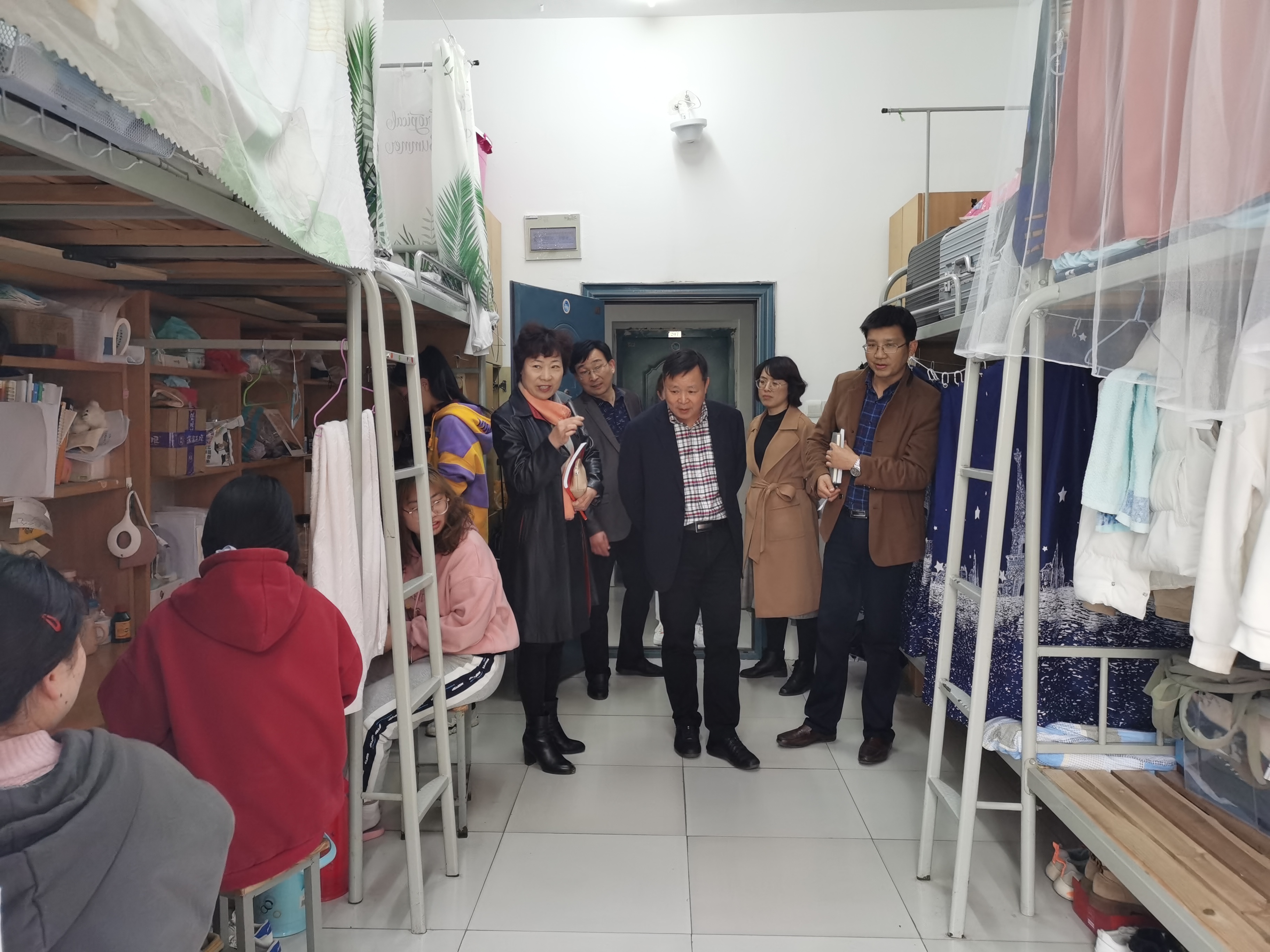 侯进元等一行实地走访了我院学生劳育基地、宿舍和文化走廊,查看了学生德育档案、辅导员值班记录、日常考勤公示等资料,了解学生劳育教育成果、宿舍的卫生、安全及生活等情况,并与学生进行了亲切交流。