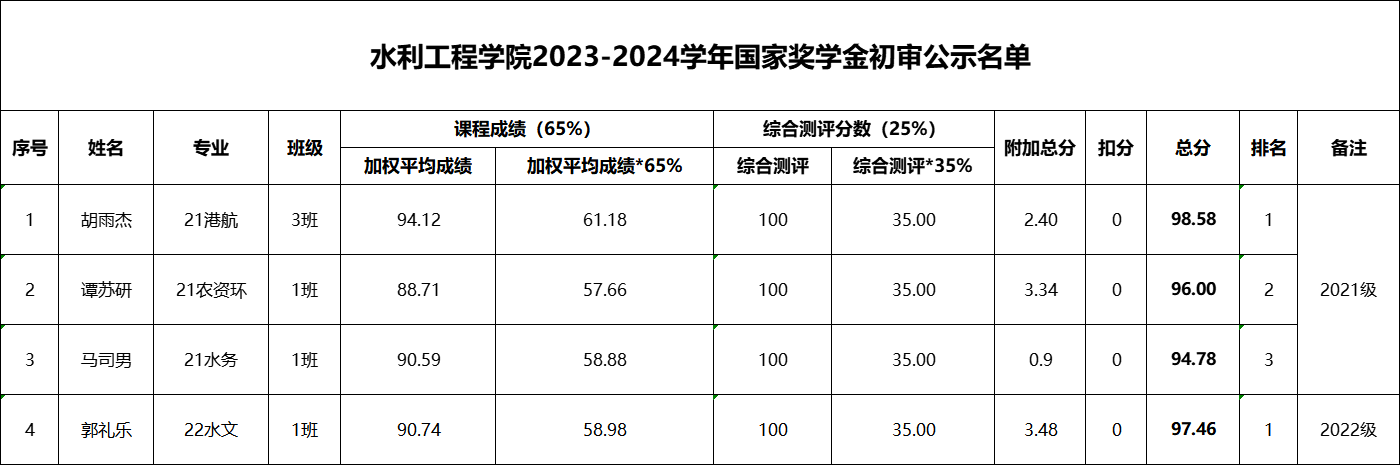 水利工程学院2023-2024学年国家奖学金初审公示名单