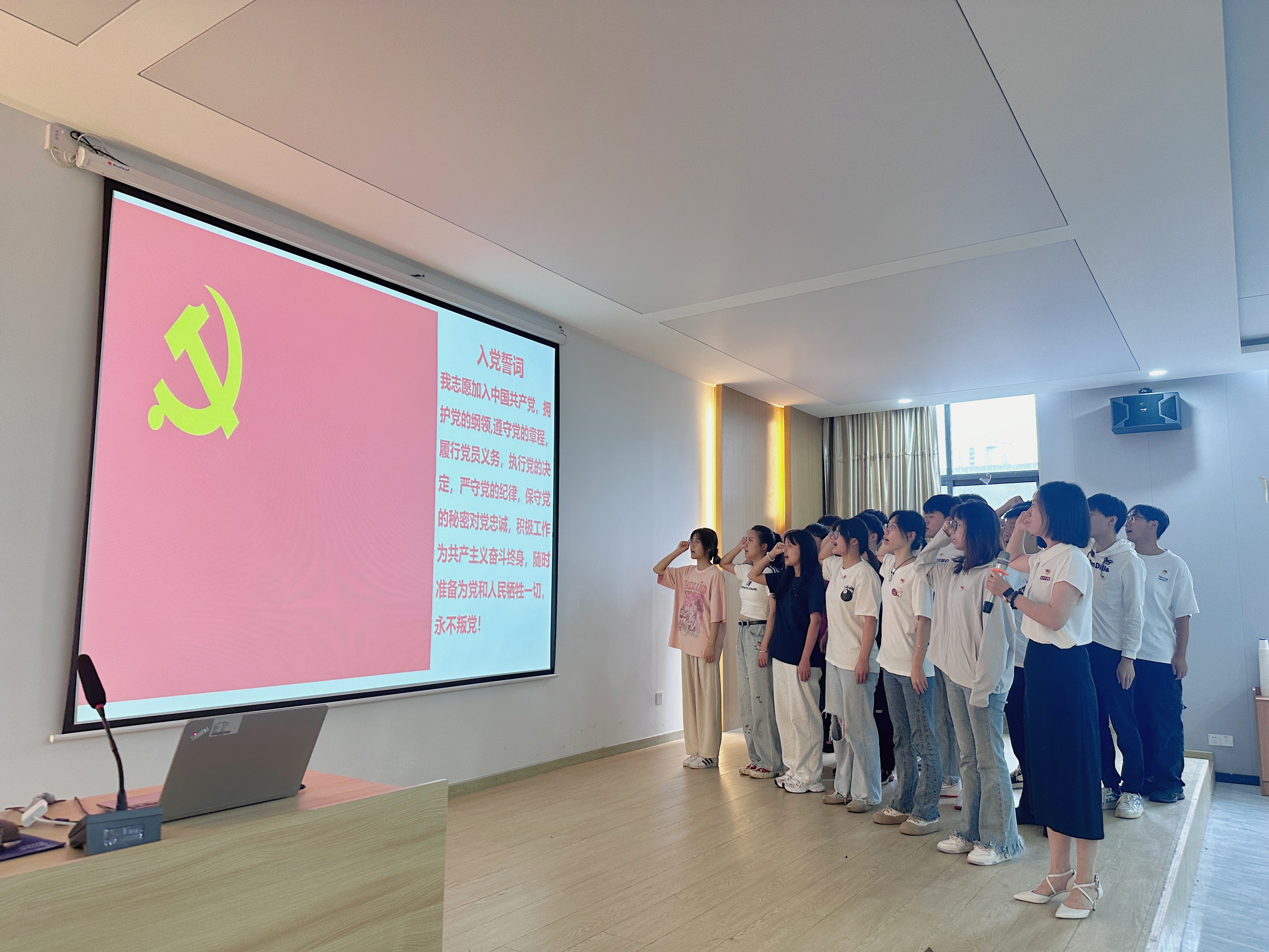 会议在庄严肃穆的《国际歌》中拉开帷幕,王瑜宣读了23名新发展党员名单,并带领新党员进行庄严的入党宣誓。全体师生党员面向鲜红的党旗,右手握拳齐肩举起,铮铮誓言掷地有声,表达了对党的崇高信仰与无限忠诚以及为党的事业奋斗终身的坚定决心。