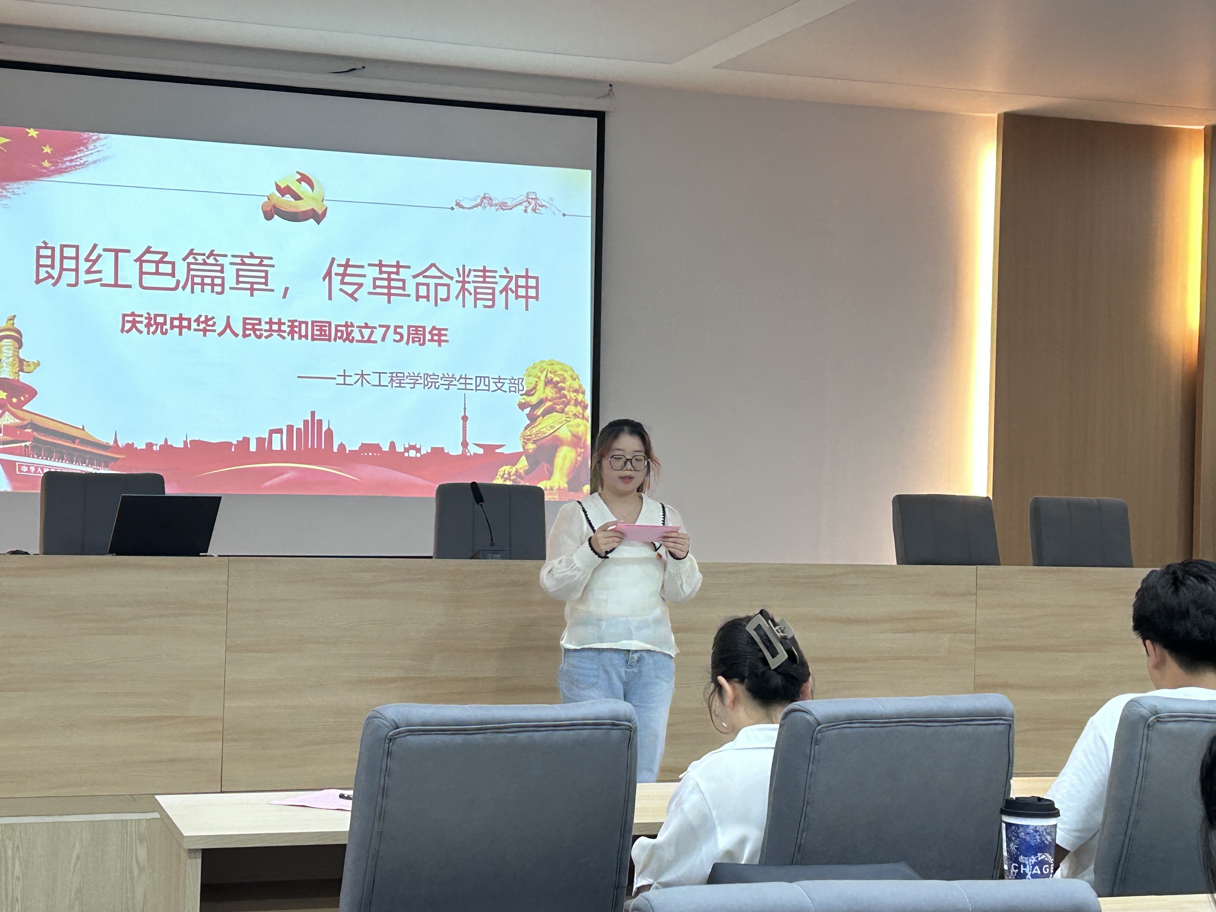 为深入贯彻落实党的二十届三中全会精神,热烈庆祝中华人民共和国成立75周年,引导青年学生树立远大理想、厚植爱国主义情怀,9月25日下午,土木工程学院学生四支部举办了“朗红色篇章,传革命精神”诗词朗诵会主题党日活动。学院师生党员以诗歌的形式,用最诚挚的情感向祖国告白,共同庆祝祖国母亲的生日。