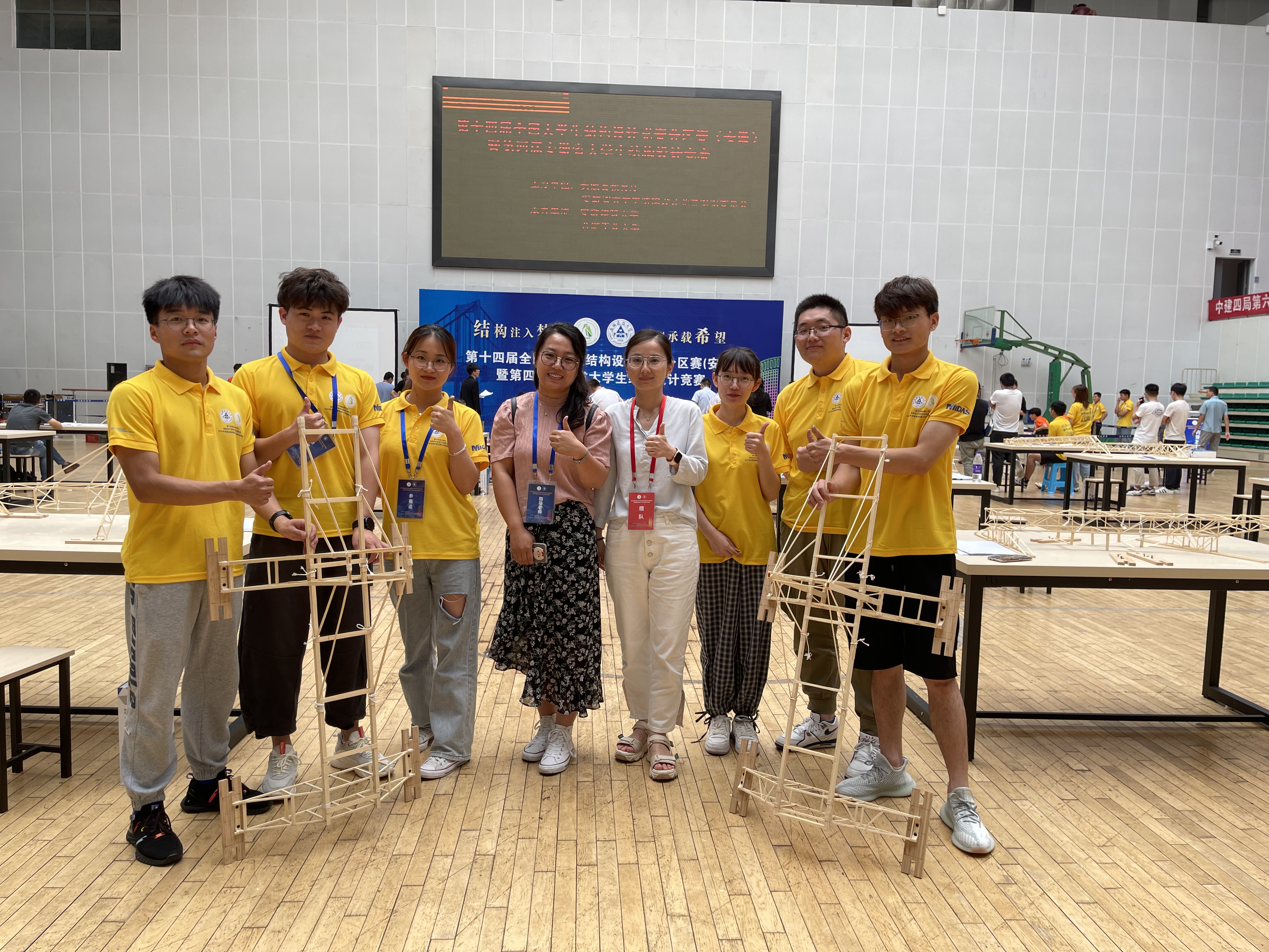 第十四届全国大学生结构设计竞赛分区赛(安徽)暨第四届安徽省大学生结构设计竞赛于今年6月24日至6月27日在安徽建筑大学成功举办。土木工程专业学生朱辉光、仇云龙、阮紫薇完成的作品《喵喵大桥》和毛钧林、丁新言、吴艺秀完成的作品《旺旺大桥》均获得了三等奖。
