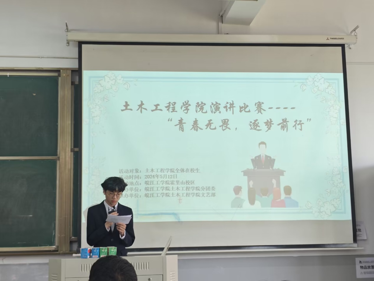 为进一步丰富校园文化生活,充分发挥校园文化的育人功能,展示我院大学生风采,营造朝气蓬勃、向上向善的校园文化氛围,5月12日,由土木工程学院分团委主办、院文艺部承办的“青春无畏,逐梦前行”演讲比赛在霍里山校区A202教室顺利举办。