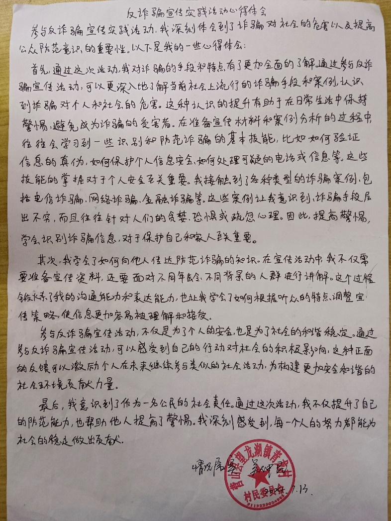 据统计,此次活动共发放宣传资料100余份,覆盖村民超过200人,取得了良好的宣传效果。村民们纷纷表示,通过此次活动,他们对诈骗有了更深刻的认识,今后将更加警惕,避免上当受骗。完成了反诈骗宣传活动后,我手写了一份心得体会,获得了村委书记的高度赞赏,他指出:“年轻人有着明辨是非的能力,不会轻易的被网上的诈骗团伙欺骗,年轻人有着蓬勃的朝气,希望以后有着更多的宣传活动造福群众”。