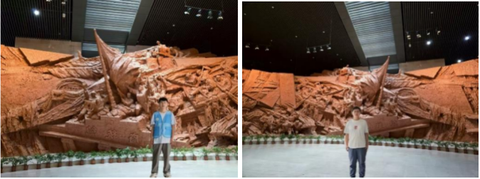 团队成员怀着崇敬之心步入场馆,序厅内巨型浮雕《百万雄师过大江》率先带来视觉与心灵的双重震撼。不远处,渡江战役胜利纪念碑高耸入云,如利剑直刺苍穹,象征人民解放军无坚不摧的战斗力量;纪念碑周边绿树成荫、广场开阔,在蓝天白云映衬下更显庄严肃穆,成员们沿步道缓缓前行,对革命先烈的敬仰之情愈发浓厚。