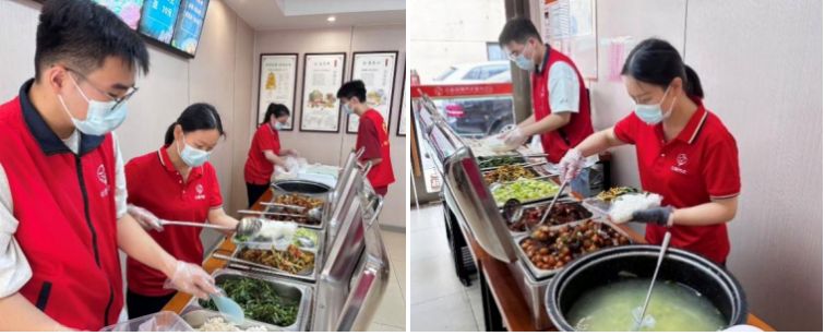 活动当日上午,志愿服务队队员早早抵达养老服务中心,首要任务便是协助工作人员筹备老人们的午餐。食堂内,队员们迅速分工、默契配合:有的细心将热菜、米饭分装到餐盘,确保每份餐食分量适宜;有的主动走到老人身边,轻声询问饮食偏好与特殊需求。针对行动不便的老人,队员们更是小心翼翼端着餐盘送到座位前,耐心协助老人调整坐姿,甚至手把手帮老人擦拭嘴角,全程细致又贴心。整个分餐过程井然有序,队员们脸上始终挂着温暖笑容。一筷一勺间,传递的不仅是热气腾腾的饭菜,更是青年学子对长者的尊重与关爱。