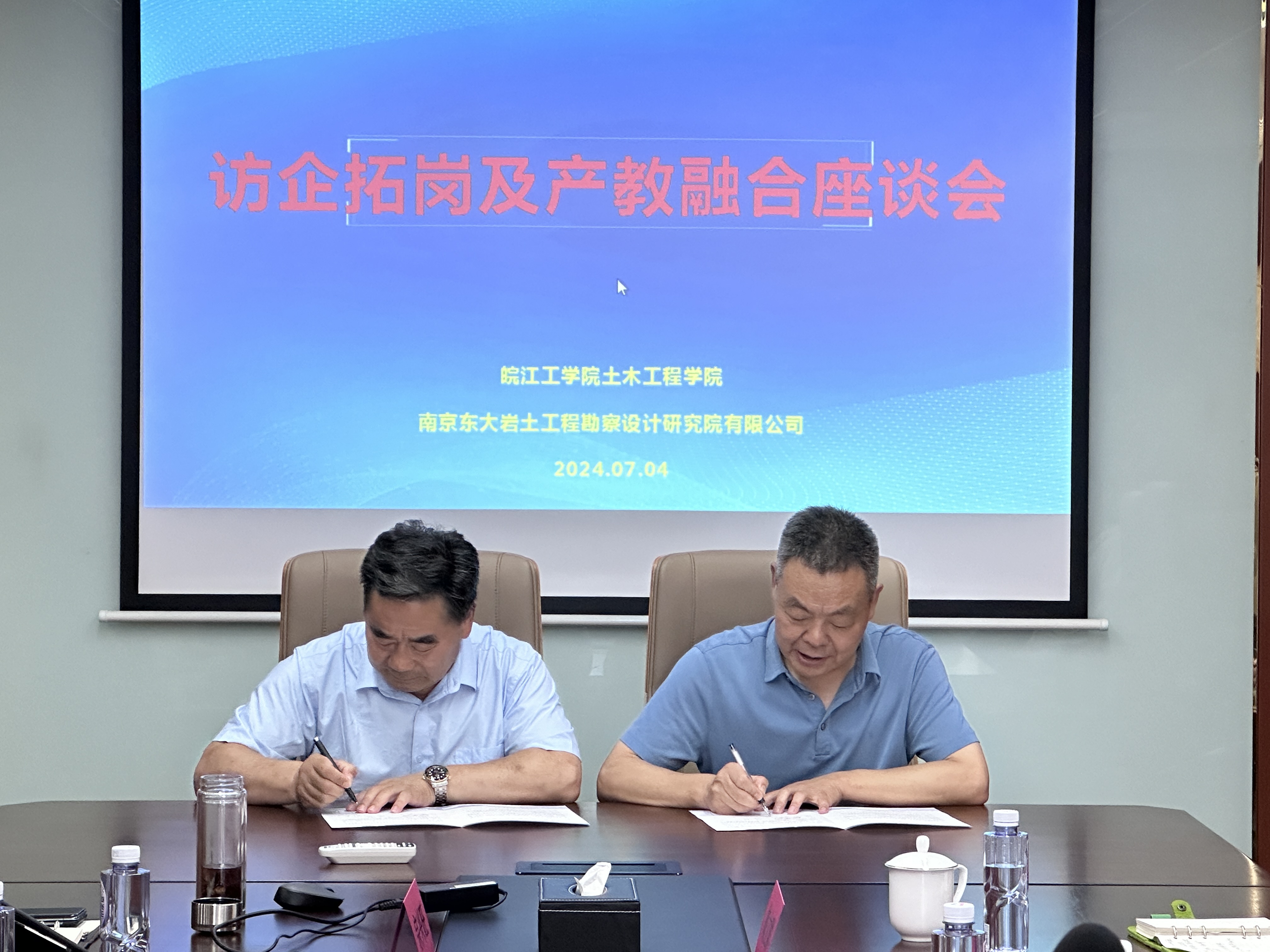 随后,唐德高一行来到南京东大岩土工程勘察设计研究院进行交流座谈。会上,南京东大岩土工程勘察设计研究院总经理刘义怀介绍了单位的发展历程、业务成果等基本情况,唐德高从办学实力、办学特色、专业发展、人才培养等方面综合介绍了我校和学院近年来的发展情况,并表示希望在人才培养及学生实习就业创业等方面进行深度合作,积极为学生成长成才创造更广阔的舞台。双方围绕传统专业改造升级、产学研融合等相关问题展开了深入探讨,并签订了人才培养与就业基地建设合作协议。