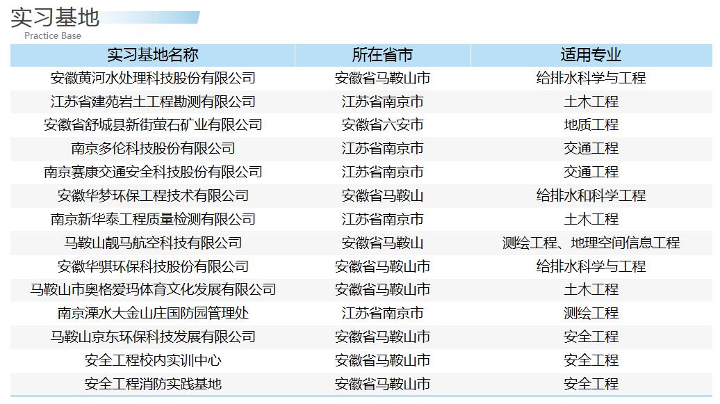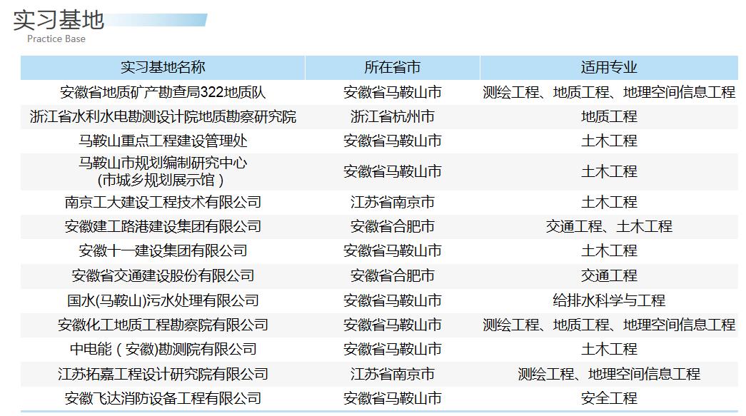 学院高度重视学生实践能力的培养和科学研究工作,努力搭建科研平台,现有马鞍山市工程监测与安全监控工程技术研究中心、马鞍山市土地检测评估与修复工程技术研究中心、皖南山区地质灾害防治重点实验室、交通科学院研究所、材料科学技术研究所等平台。学院实习实训条件完备,现有26个校内实验室,主要仪器设备近1200台套;学院在安徽、浙江和江苏等省,遴选出一批优质企业,签订长期校企合作协议,确保每个专业有3个稳定的实习基地,开展各专业实践教学活动,为教学和科研提供了充足保障。