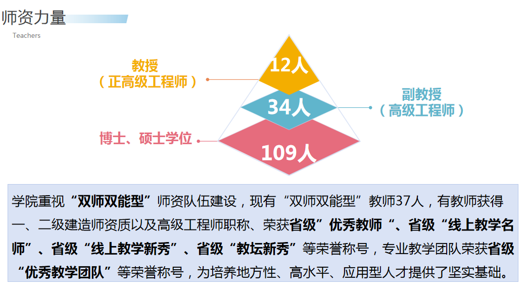 土木工程学院现有教职工128人,专任教师109人,以中青年教师为主体,师资队伍结构合理、素质精良,充满发展活力;学历层次优异,98% 的专任教师具备硕士及以上学位;职称结构科学,教授 (正高级)12 人、副教授(高级工程师)34 人,高级职称教师占比达 43%,专业梯队建设成效显著;“双师”特色鲜明,37 名教师获 “双师双能型” 资格认证,另聘 19 名企业兼职教授,深度融合行业实践与教学科研;荣誉成果丰硕,多人获评省级 “优秀教师”“教学名师”“教坛新秀”等,专业教学团队荣获省级 “优秀教学团队” 称号,整体教学科研实力强劲。