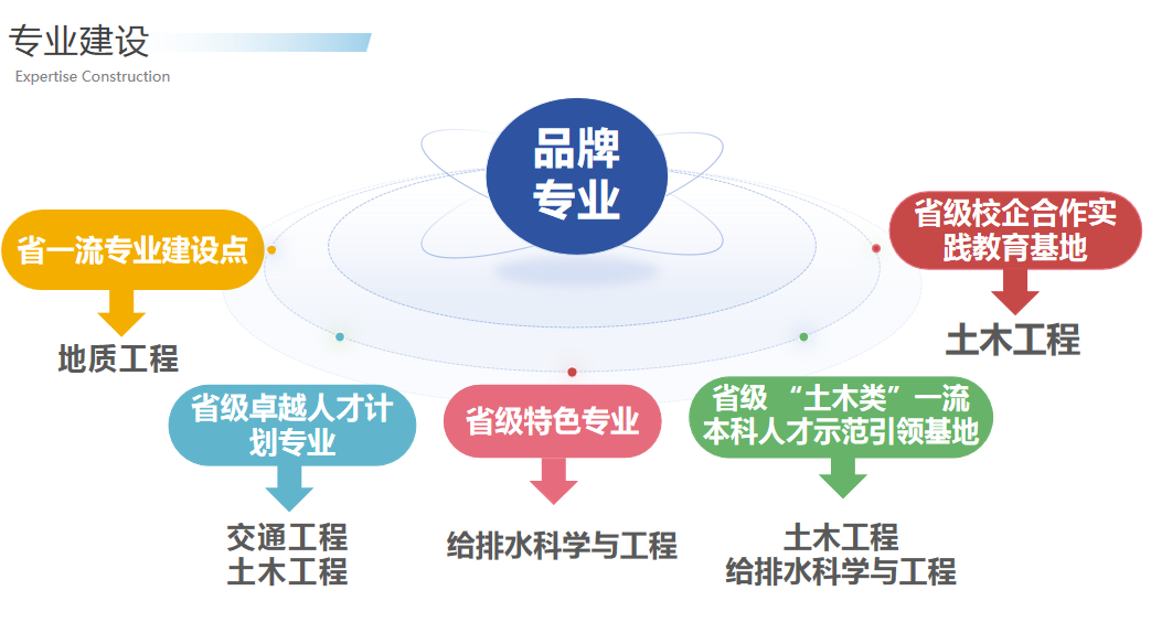 地质工程专业为安徽省一流本科专业建设点、安徽省振兴计划新专业建设点;土木工程专业为省级 “土木类”一流本科人才示范引领基地、安徽省卓越工程师教育培养计划专业、省级校企合作实践教育基地;给排水科学与工程为省级特色专业、校一流专业建设点。设有土木工程专业“闻天班”和给排水科学与工程专业“闻天班”。