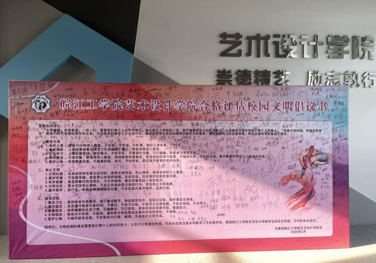 活动最后,全体参会学生依次在印有"18新利怎样艺术设计学院合格评估校园文明倡议书"的承诺墙上郑重签名,以此表达支持评估工作的坚定决心,现场气氛庄重而热烈。