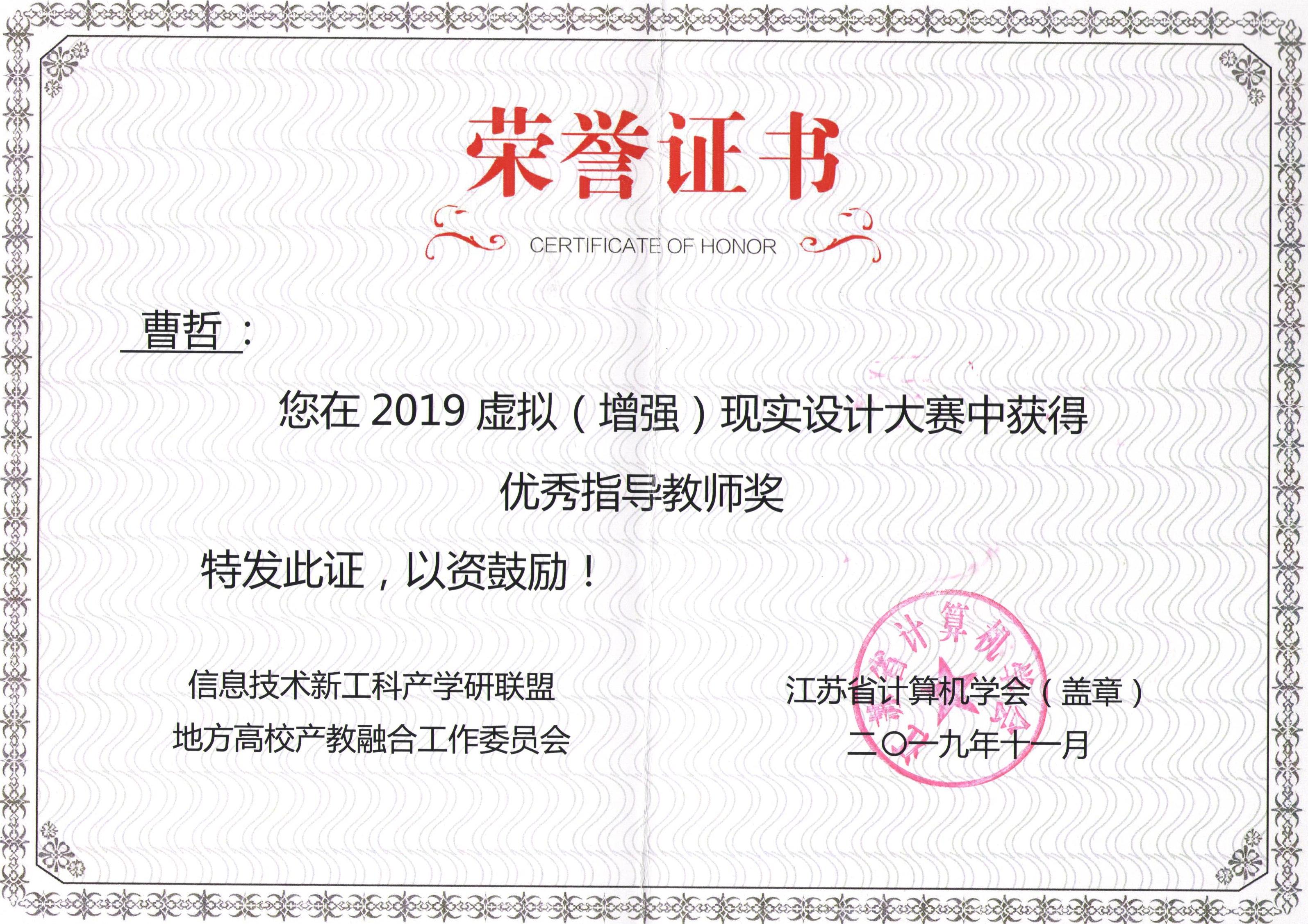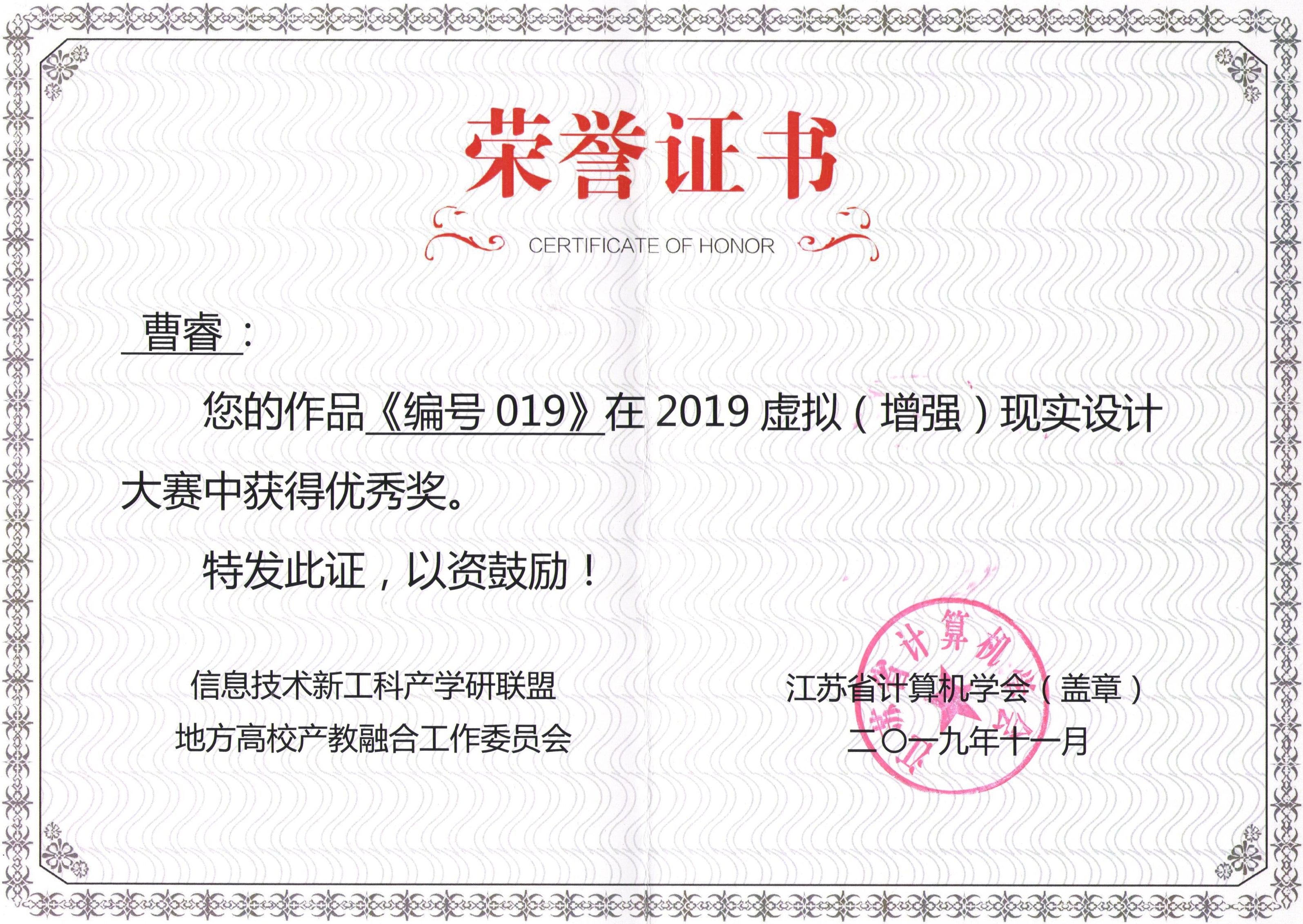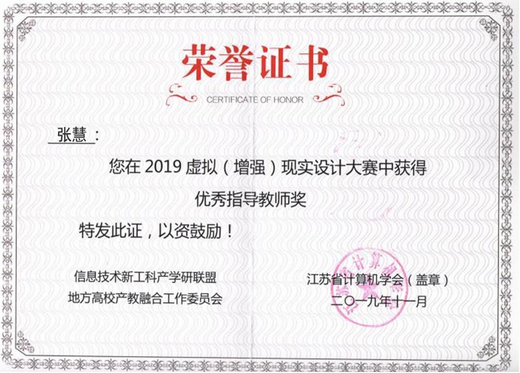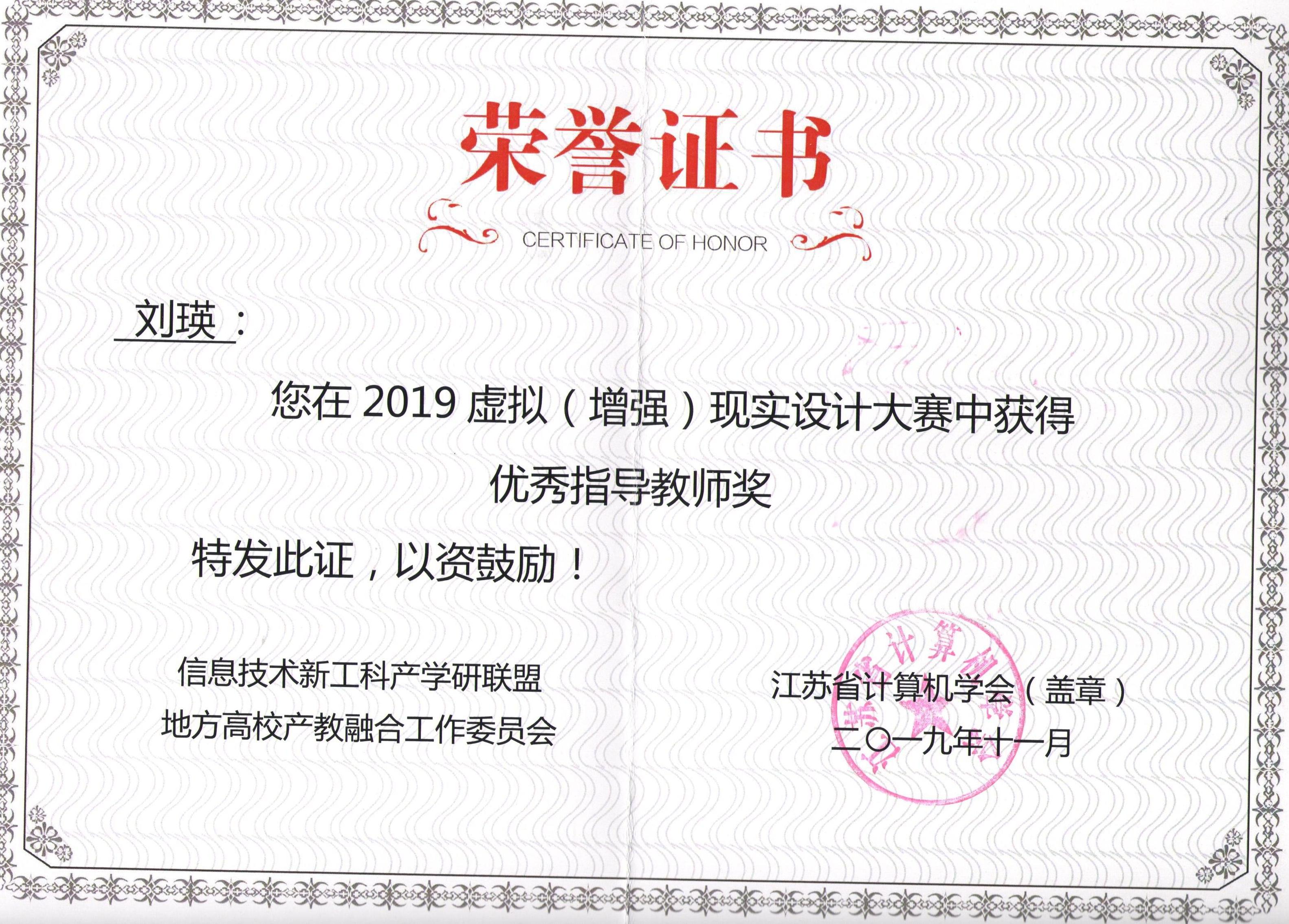 2019年江苏虚拟(增强)现实技术大赛在江苏省新工科教育联盟指导下,由金陵科技学院、江苏省计算机学会及江苏省运动竞技协会主办的一项AR/VR产业重要赛事。本次大赛我校艺术设计学院获得优秀组织奖,刘瑛、曹哲、张慧、施艺、许戎以及王艺霖等数位教师优秀指导教师奖,朱苏滢、付玉敏、陈玥和曹睿等学生分别获得二等奖、三等奖以及优秀奖若干名。