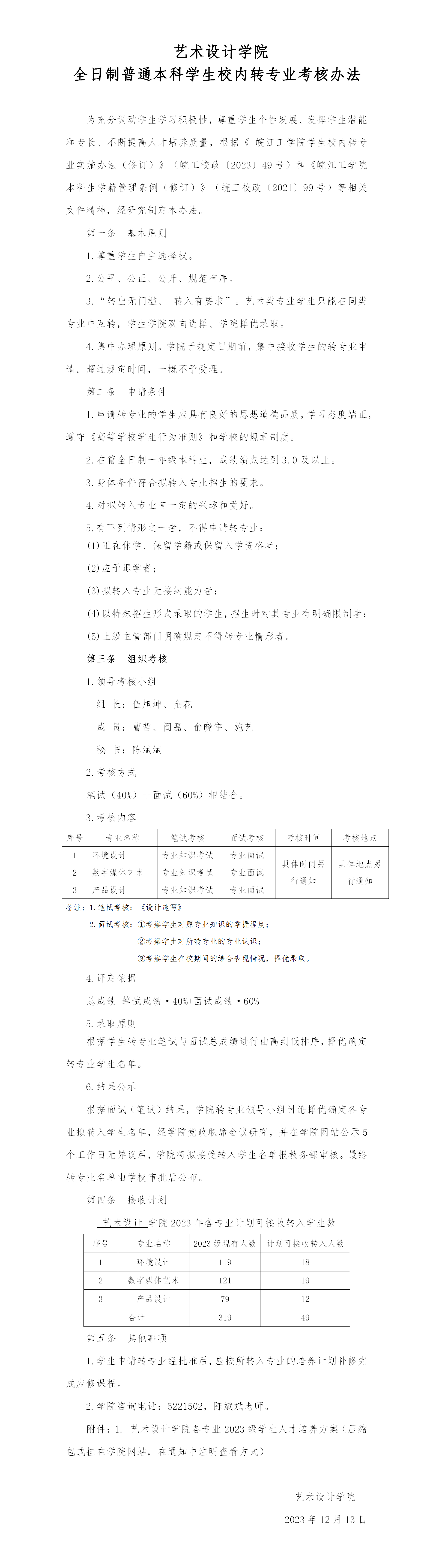艺术设计学院全日制普通本科学生校内转专业考核办法
