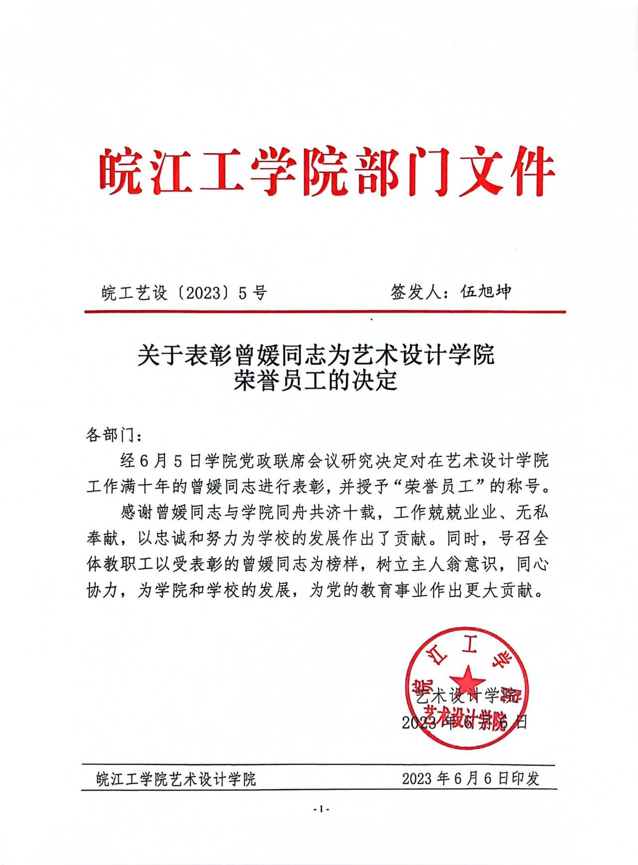 关于表彰曾媛同志为艺术设计学院荣誉员工的决定