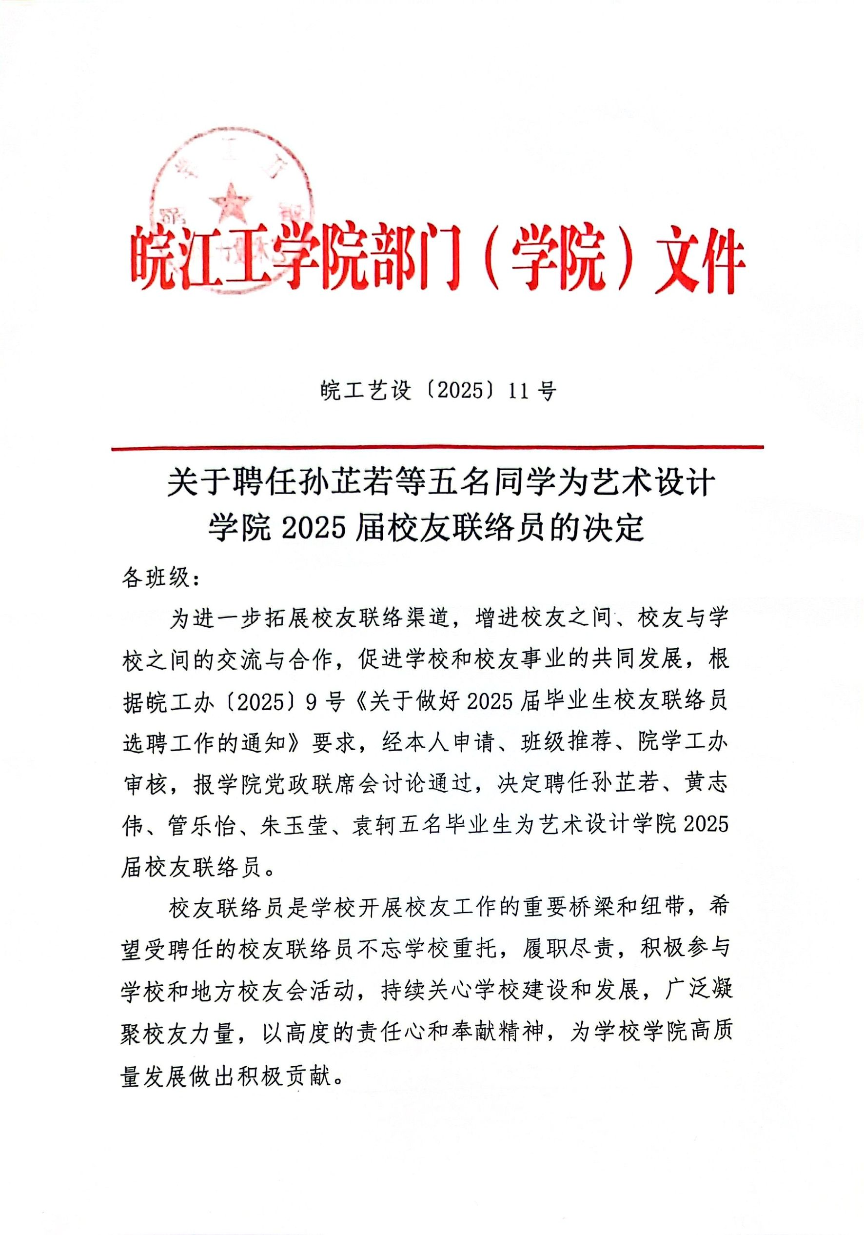 关于聘任孙芷若等五名同学为艺术设计学院2025届校友联络员的决定