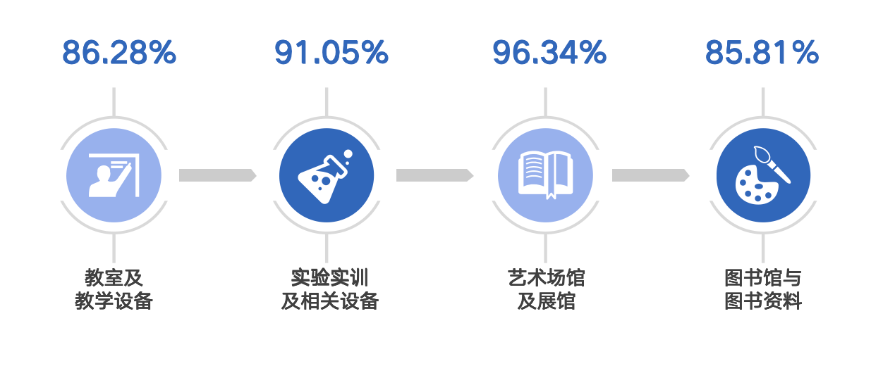我院毕业生对母校的整体满意度评价较高,我院 2023 届毕业生对母校的总体满意度为 95.21%。用人单位对我院毕业生的总体满意度为100%,其中很满意的比例为 15.36%。九成以上的毕业生认可母校的教学工作,教师整体指导效果较好。我院 2023 届毕业生对教师学习指导、职业规划和就业指导的满足度评价分别为 91.68%、89.19%、90.06%。教室教学设备、实验设备、艺术场馆及图书馆满足学生学习需求。我院 2023 届毕业生对“教室及教学设备”“实验、实训及相关设备”“艺术场馆及展馆”和“图书馆与图书资料”的满意度评价较高。