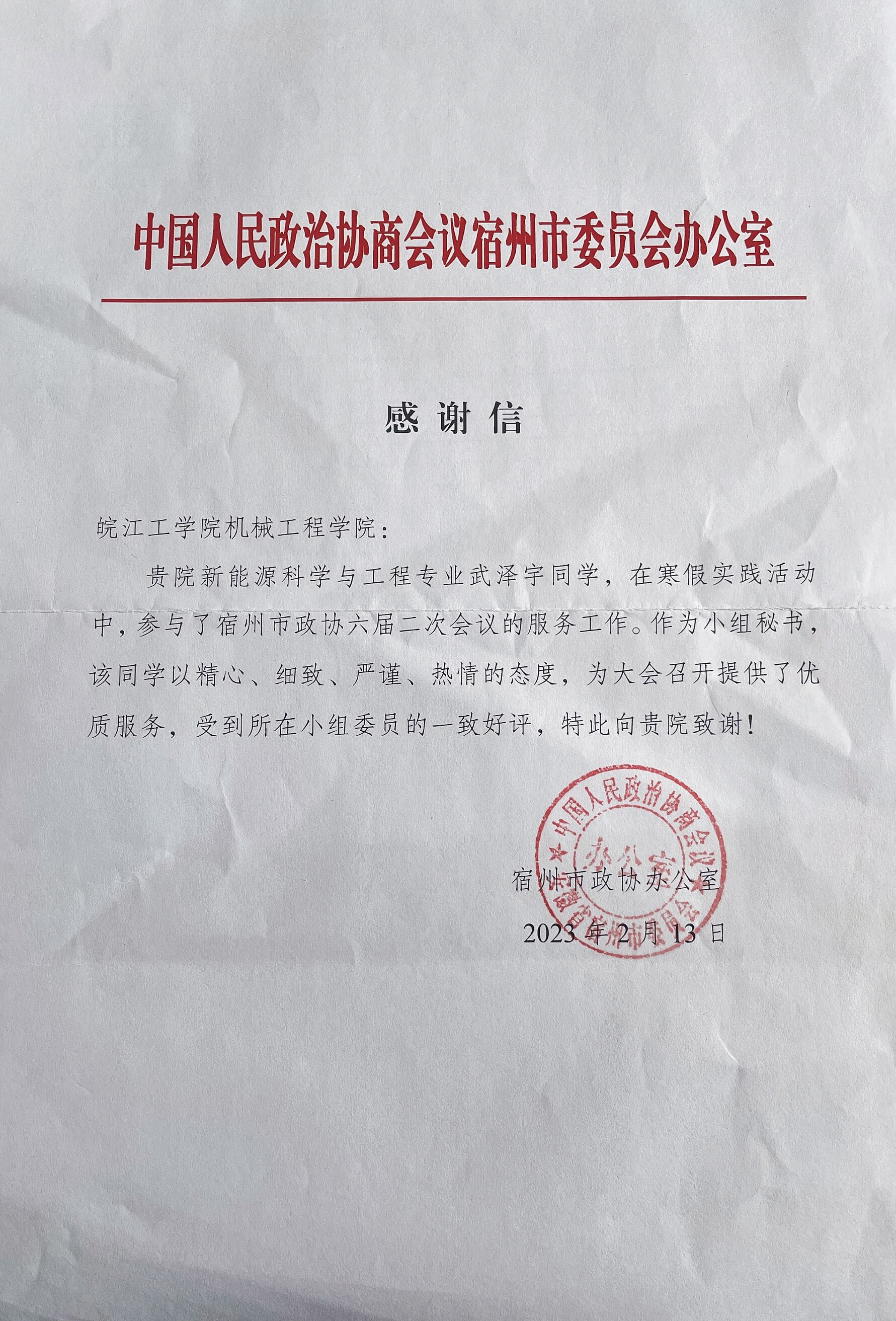 近日,我校收到中国人民政治协商会议安徽省宿州市委员会发来的感谢信,对我校机械工程学院新能源科学与工程专业2022级武泽宇同学在寒假期间积极参加志愿服务实践活动的表现予以肯定,对18新利怎样润物无声、孜孜不倦地培养出敢于担当、勇于奋斗、任劳任怨、无私奉献的新时代大学生表示感谢。